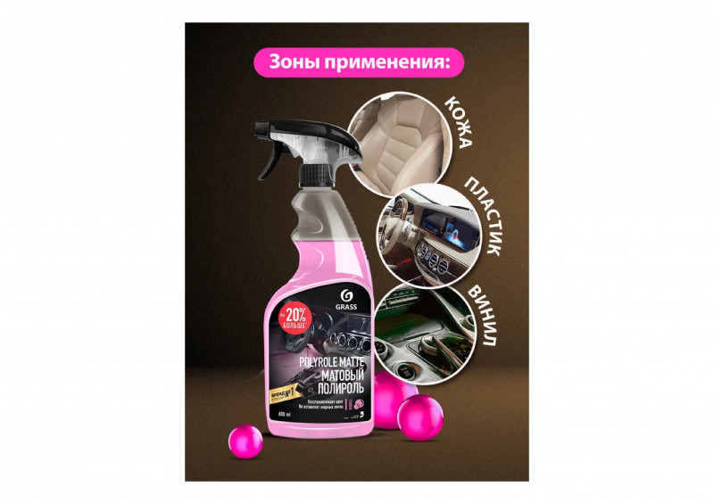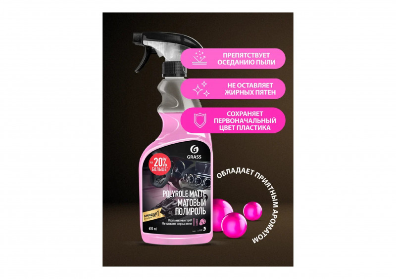 Профессиональный матовый полироль для обработки приборных панелей, очистки и полировки изделий из кожи, дерева, винила, пластика и резины. Сохраняет первоначальный цвет, не оставляет жирных пятен, препятствует оседанию пыли, придает матовый блеск. Средство обладает приятным ароматом.