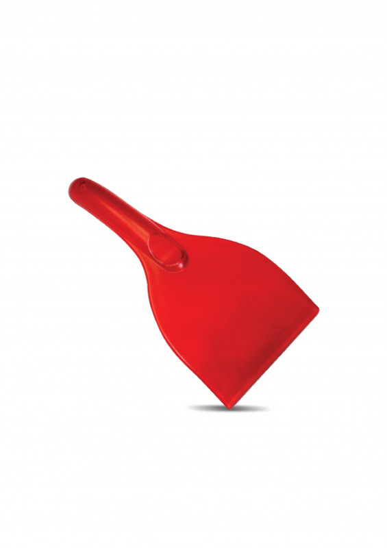 Компактный скребок красного цвета для очищения наледи и снега со стекол и зеркал автомобиля.