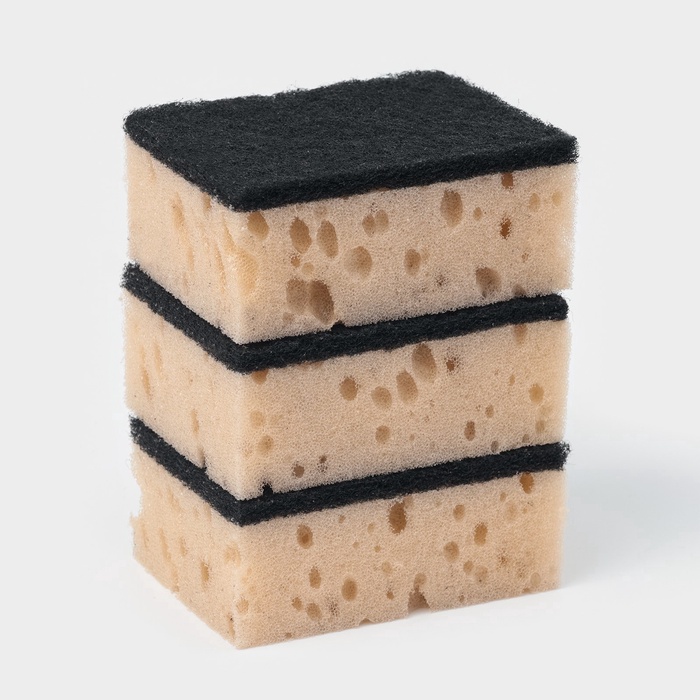 Губки выполнены из крупнопористого поролона, что обеспечивает обильное пенообразование. Благодаря структуре изделия остатки еды и жир легко вымываются. Абразивный слой поможет отмыть сильные загрязнения.
