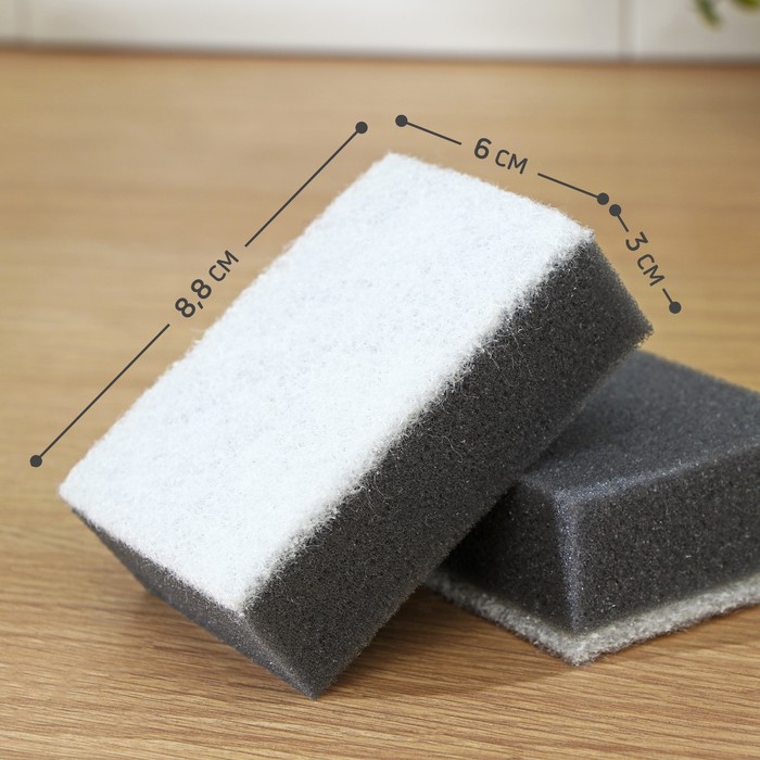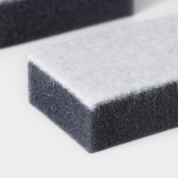 Губки выполнены из поролона с частицами угля, поэтому они обладают антибактериальными и абсорбирующими свойствами. Благодаря структуре изделия остатки еды и жир легко вымываются. Абразивный слой поможет отмыть сильные загрязнения.