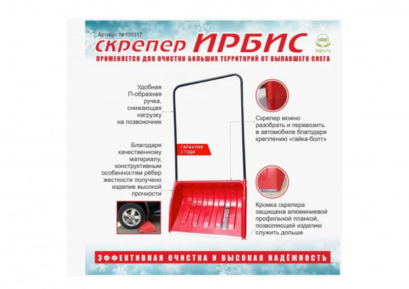 Скрепер предназначен для уборки снега на больших территориях. Ковш скрепера выполнен из первичного блоксополимера пропилена специальной марки с добавлением морозоустойчивых компонентов и усилен рёбрами жесткости, что позволило добиться прочности изделия даже при сильных минусовых температурах.