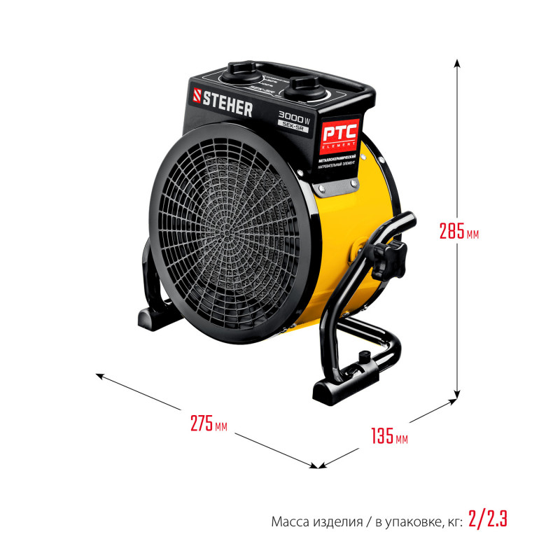 Тепловая пушка электрическая STEHER SEK-3R предназначена для обогрева небольших помещений. Благодаря малым размерам тепловую пушку легко переносить и хранить. Оснащена долговечным металлокерамическим нагревательным элементом, обеспечивающим быстрый и равномерный нагрев, экономное потребление электроэнеергии и при этом не сушит воздух. Механический терморегулятор поддерживает нужную температуру нагрева. Термопредохранитель предотвращает повреждение изделия и окружающих предметов при нештатной работе. Мощный двигатель вентилятора способствует увеличению теплоотдачи изделия за счет большого объема прокачиваемого воздуха. Степень защиты IP 20.