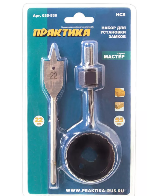 Набор для установки замков ПРАКТИКА : коронка 55 х 20 мм, перовое сверло 22 мм блистер