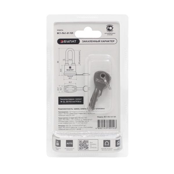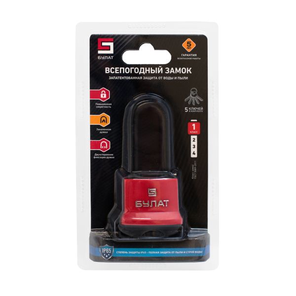 Всепогодные замки Булат с запатентованной конструкцией и способами защиты. Патент №ZL201921447930.6 Протестированная и подтвержденная защита от воды. Классификация – IP65. Защищенность от пыли и влаги сертифицируется в рамках европейской классификации IP (International/Ingress Protection Rating — «Степень защиты оболочки»). Испытания проводятся в соответствии со стандартами IEC 60529 и ГОСТ 14254–2015. Маркировка IP65 обозначает: • 6 – полная защита от песка и пыли; • 5 – защищен от струй воды Замок навесной «БУЛАТ» предназначен для запирания, распределительных щитов, почтовых ящиков, гаражей, складов, подвалов и прочих помещений. Замок запирается автоматически при нажатии на скобу без использования ключа. Пластиковый кожух защищает замок от внешнего воздействия окружающей среды. Замок обладает длительным сроком эксплуатации. Гарантийный срок 5 лет с момента продажи через розничную сеть. Размер корпуса: 41х33,5х24 мм Диаметр дужки: 6,5 мм Проем дужки по высоте: 48 мм Проем дужки по ширине: 14,5 мм