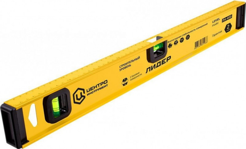 Уровень ЦИ ЛИДЕР Л4 400 мм. Имеет двутавровый усиленный профиль толщиной 3,6 мм, 3 акриловых колбы. Третья колба поворотная и позволяет выставлять необходимый угол. Оригинальная конструкция обеспечивает удобство при работе и точность при измерениях.